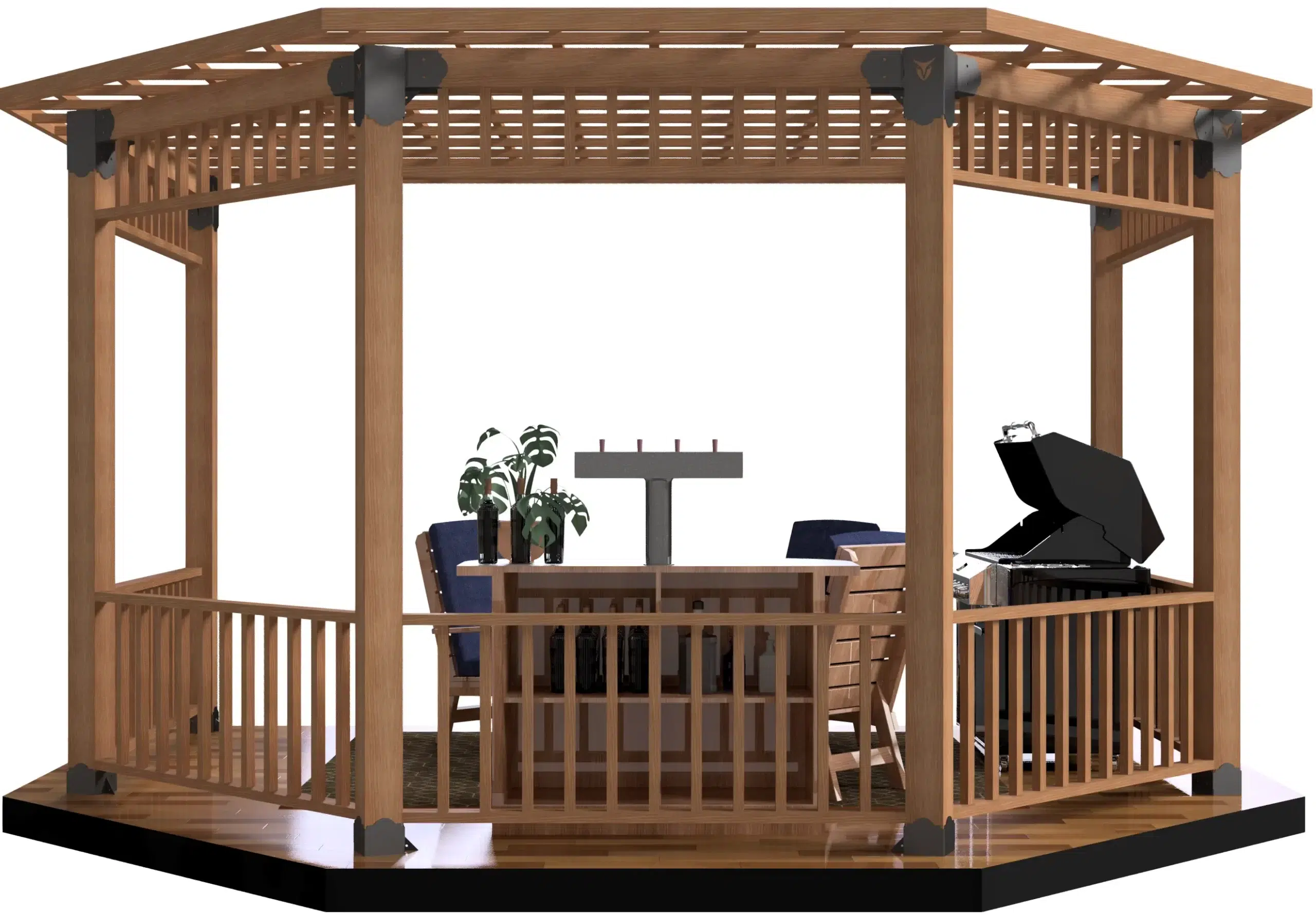 This is a true 100% DIY-friendly, 6×6, Floating Partial Octagon Gazebo Kit. Our Drop-in Smart DIY post top elbows make it super easy and safe to assemble the headers. Unlike closed tube elbows which require extreme effort and heavy lifting equipment, our Drop-in Smart DIY design requires minimal physical effort and eliminates physical injury risks. Floating deck design allows you to build this anywhere solid and stable ground is available without having to pour a concrete pad. Inside the deck area, fill with sand and add pavers or other suitable floor material or build a wooden deck support structure and add long woodgrained ceramic tiles.