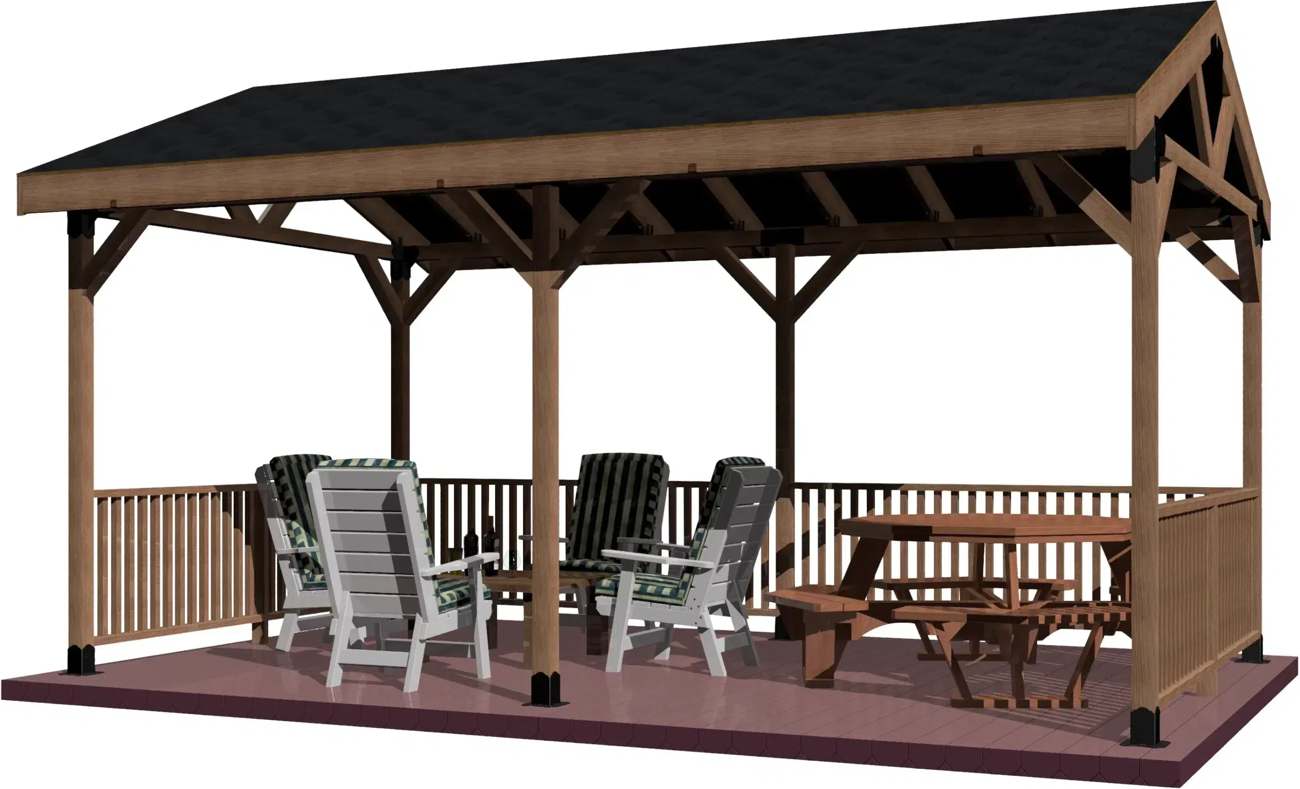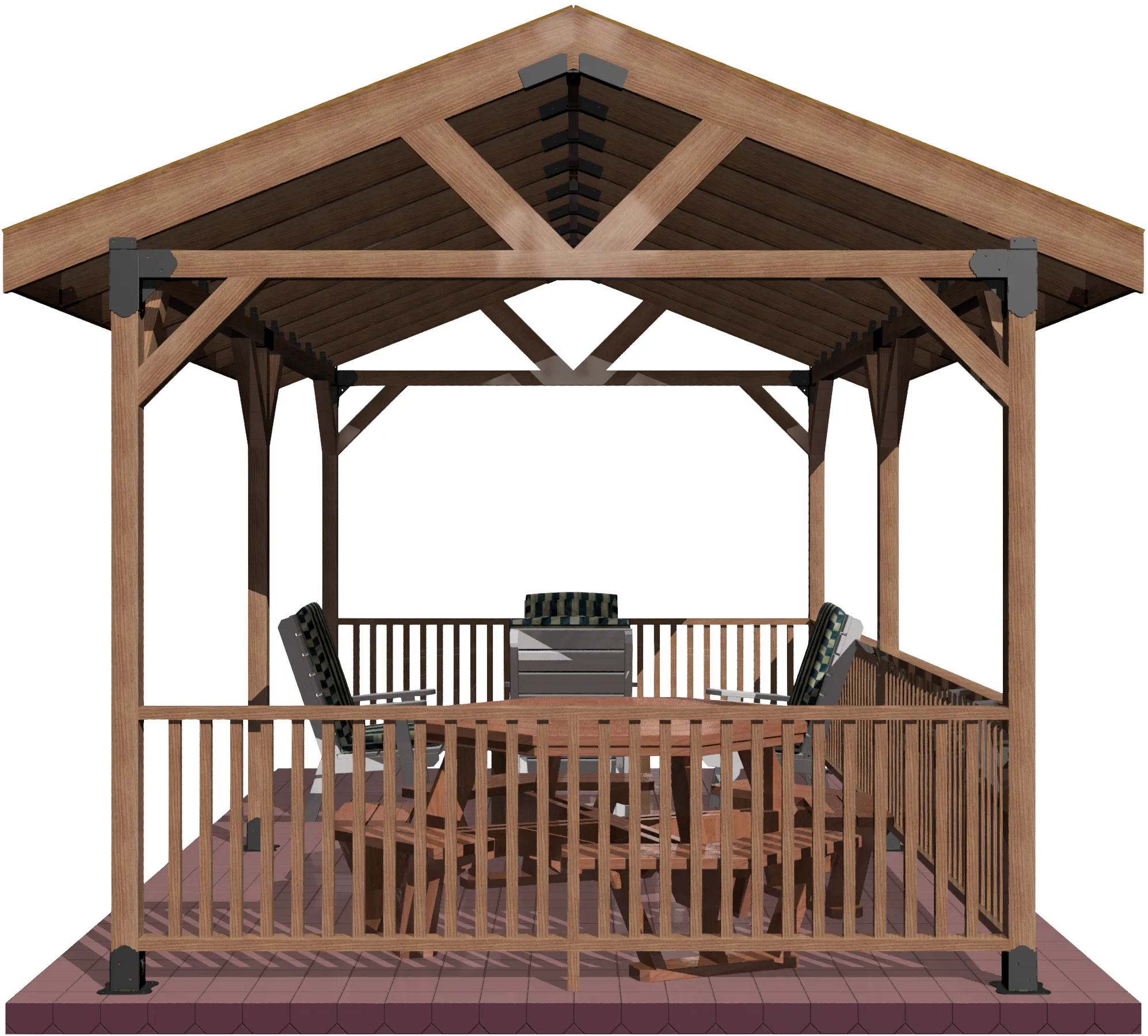 This 4×4 pavilion can be built on concrete footings, concrete slab (slabs require new footing under posts). The posts can also be buried into the ground and concrete poured around the posts. However, we do not recommend this method which leads to inaccurate post locations and buried posts in the ground will eventually rot. Instead, pour concrete into the post hole first, then use our post anchor bracket to attach posts to the top of the concrete footings. This will yield a permanent structure with no worries about posts rottting out in the future.
