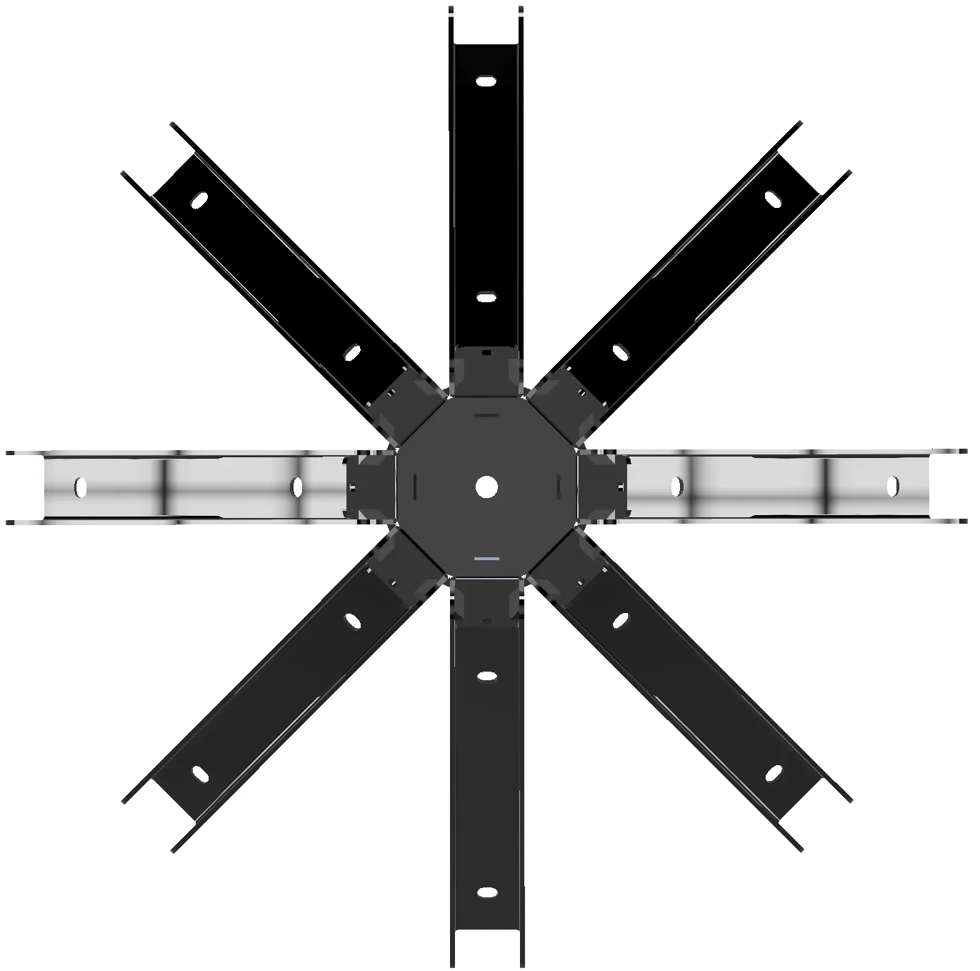 Super Heavy Duty Octagon 8-way spider bracket creates a perfect 8-way rafters joints at the peak of the octagon roof. Allows universal size octagon roof ranging from 8 feet wide to 24 feet wide.