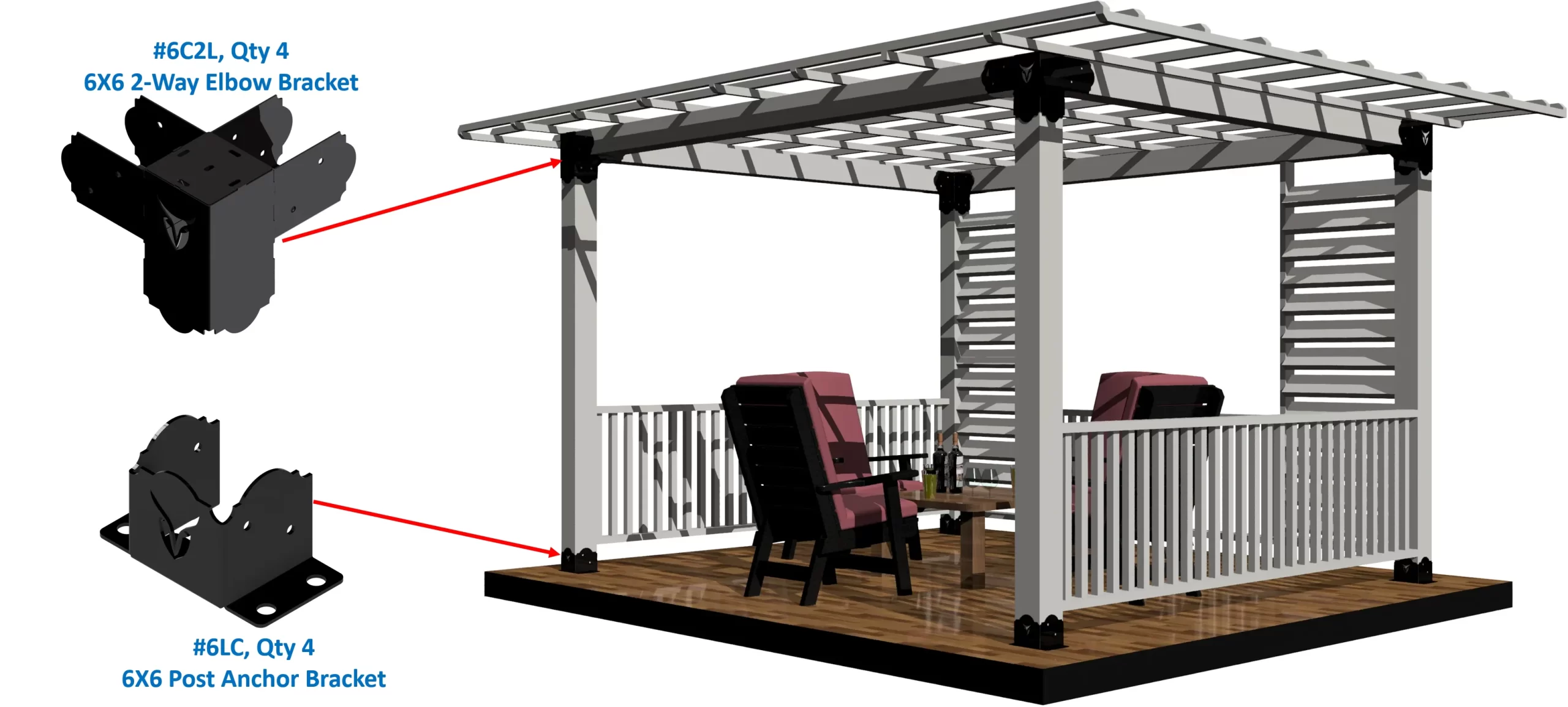 You can further increase length and width by using our 6×6 Tee Bracket. and our Post Anchor Brackets. You must buy these extra Tee and Post Anchors separately.