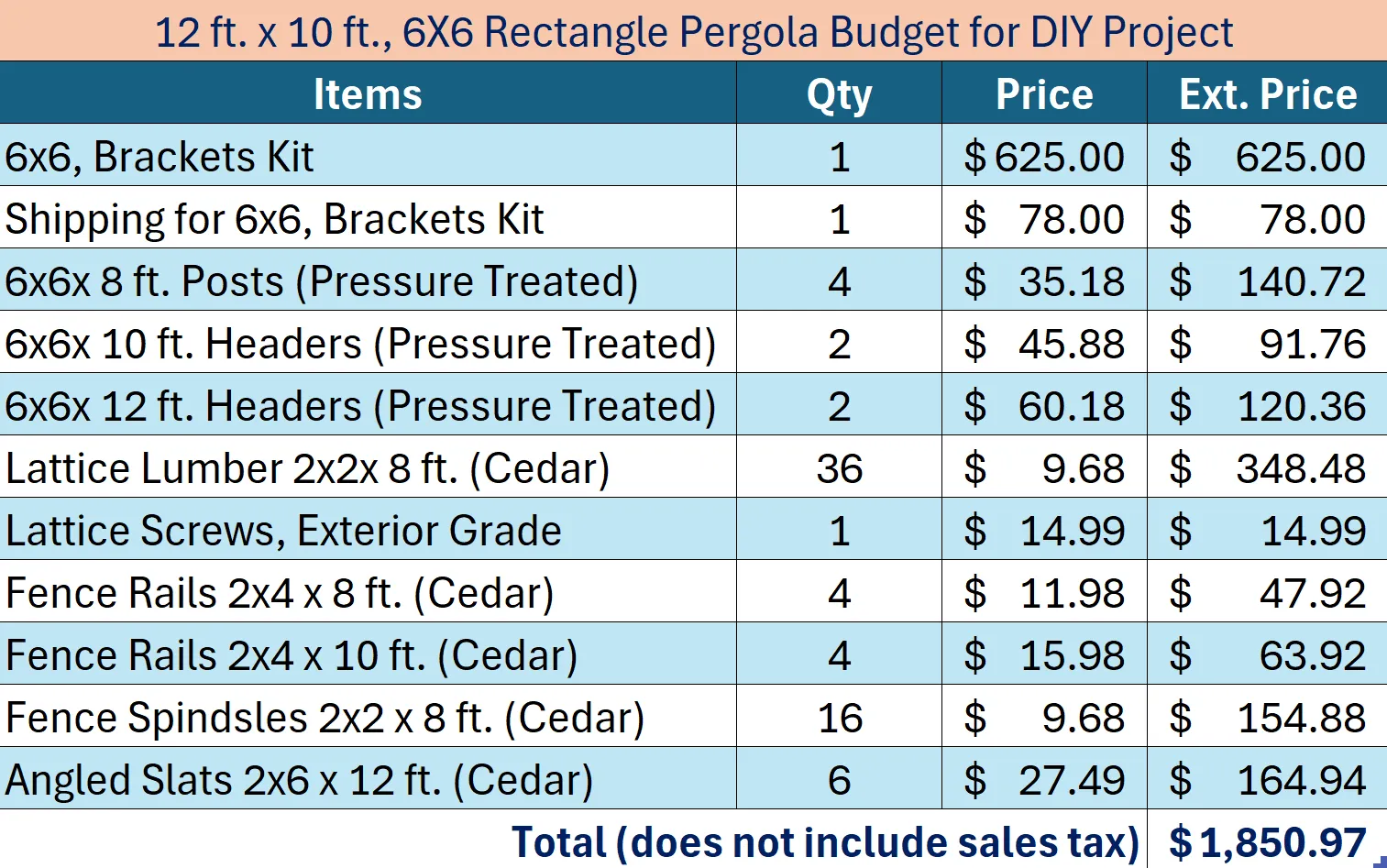 Determine your space availability, decide upon the pergola size. Contact us to request the buy list and cut list.