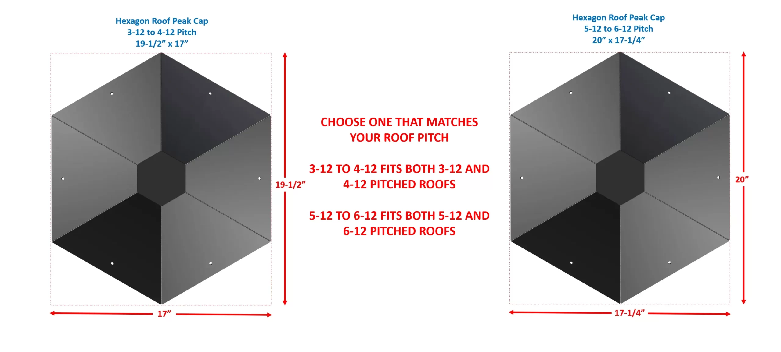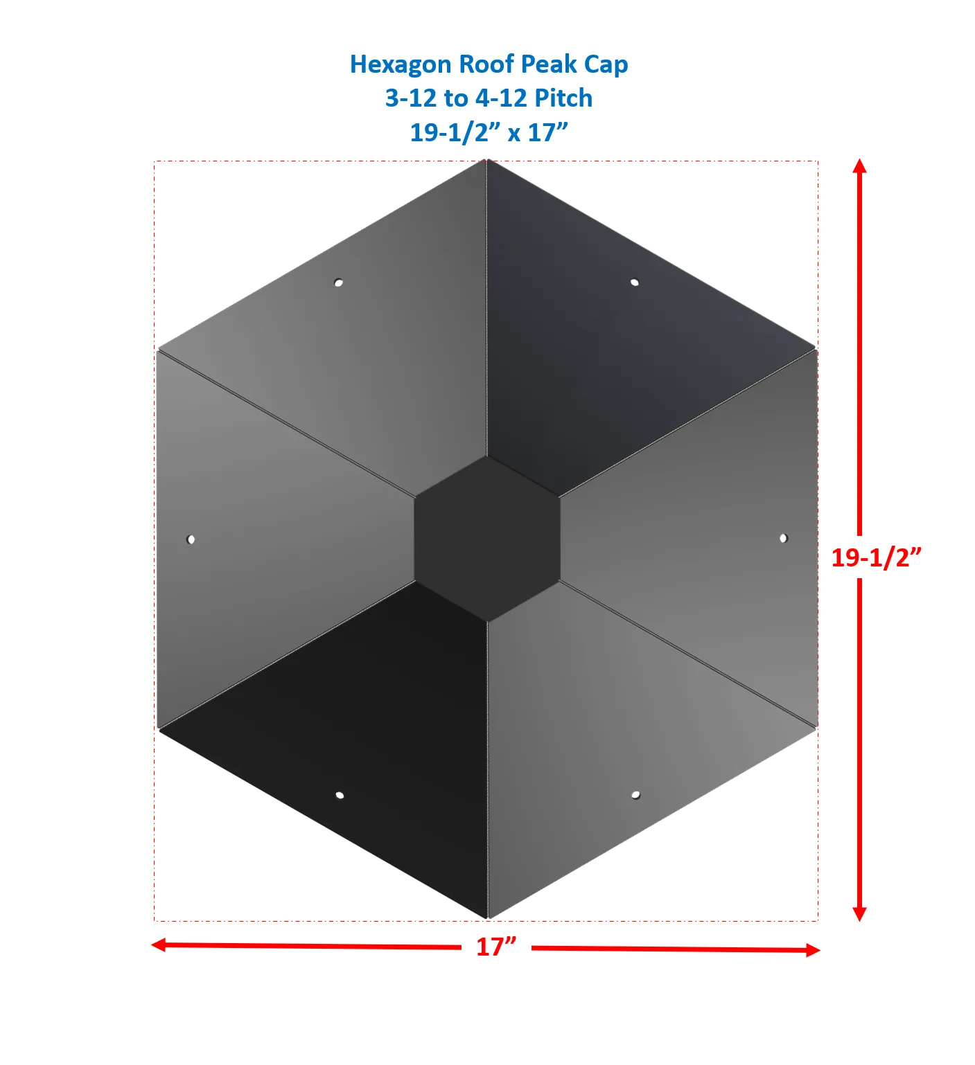 This cap is available for 3-12 to 4-12 and 5-12 to 6-12 pitched hexagon roofs. They fit perfectly at the peak and provide weather proof seal at this difficult to seal area. These caps cover a wide area around the peak (8-1/2″ to 9-1/2″ on all sides from the peak). Simply apply roof sealant to the underside of this cap, around the perimeter, press down on top of the roofing material (shingles or metal panels) and drive screws with rubber washers (not included) through the hole in each flat surface of this cap and into the roof deck.