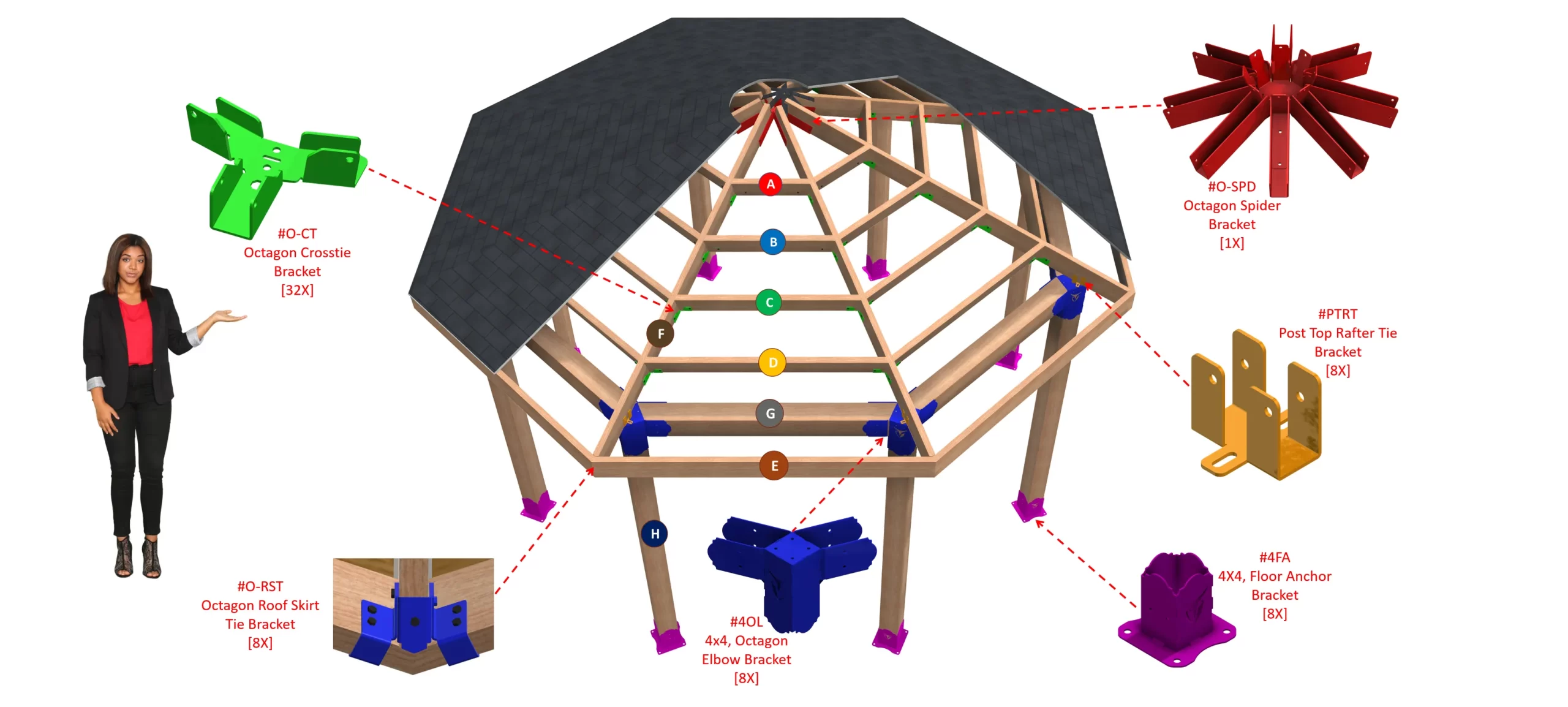 This is the one and only true 100% DIY-friendly, 4×4, Surface Mounted, Octagon Gazebo Brackets Kit. Offered only by RioOutdoors.com. It has a 4-12 pitch roof slope which can support any snow load.