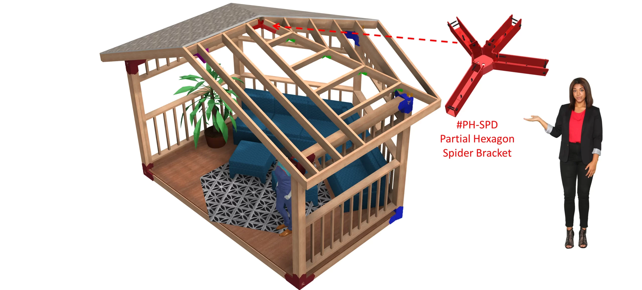 Partial Hexagon 4-way spider bracket creates a perfect 5-way rafters joints at the peak of the partial Hexagon gazebo roof and peaks of linear hexagon pavillions.