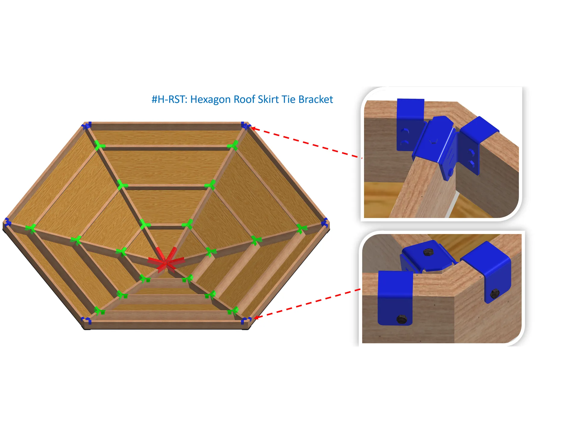 It is super-easy to install at the end of each rafter; provides two roof skirt mounting U-channels at precise angles for 5-12 pitched hexagon roof skirt lumber members.